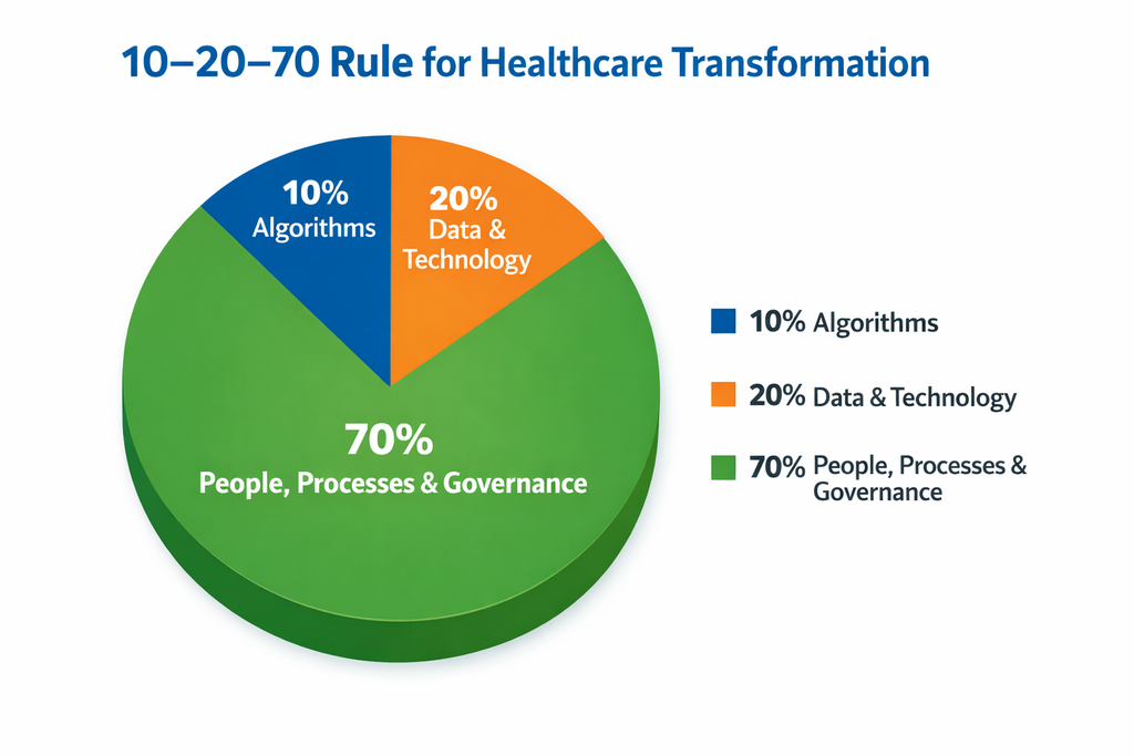 Technology alone cannot transform health care. Global success follows 10–20–70 rule: